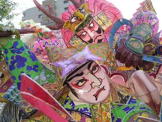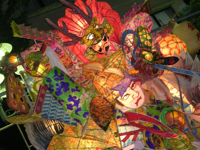 万燈は、竹を凧糸で縛り組み立てて和紙を貼り、図柄に蠟(ロウ)を引いた上に食紅で彩色して作ります。