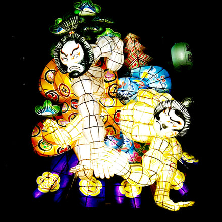 常楽寺の大相撲会は特に盛大で、勝ち残った鯰江又一郎と青地与右衛門は、その後家臣として取り立てられました。この鯰江又一郎と青地与右衛門が諸肌脱いで相撲を試合あい、投げを打ち合う様を元絵にしました。相撲を題材とした珍しい万燈です。