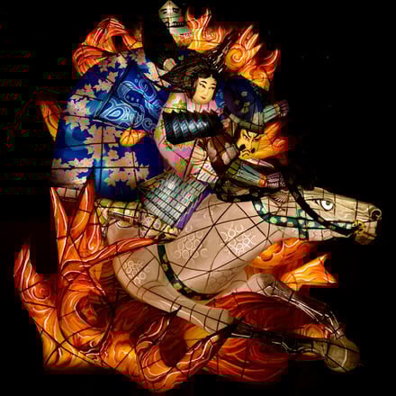 題材は、落城する大阪城から千姫を救うべく炎の中で坂崎直盛が疾走する馬の手綱をさばく構図としました。燃え盛る炎と対照的な騎馬武者の疾走感を演出しました。